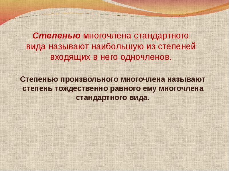 - 5. Степенью многочлена стандартного вида называют наибольшую из степеней входящих в него