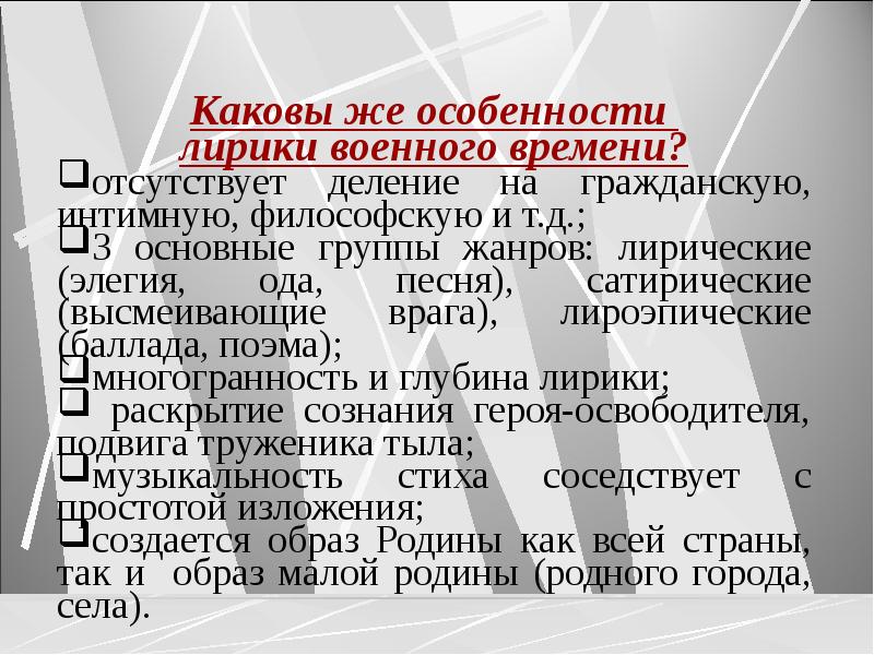 - 4. В поэзии с первых дней войны прежде всего проявила себя ЛИРИКА.