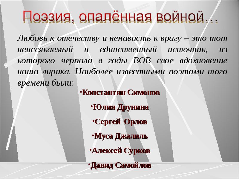 Скачать презентацию на тему Поэзия Великой Отечественной войны. можно ниже: