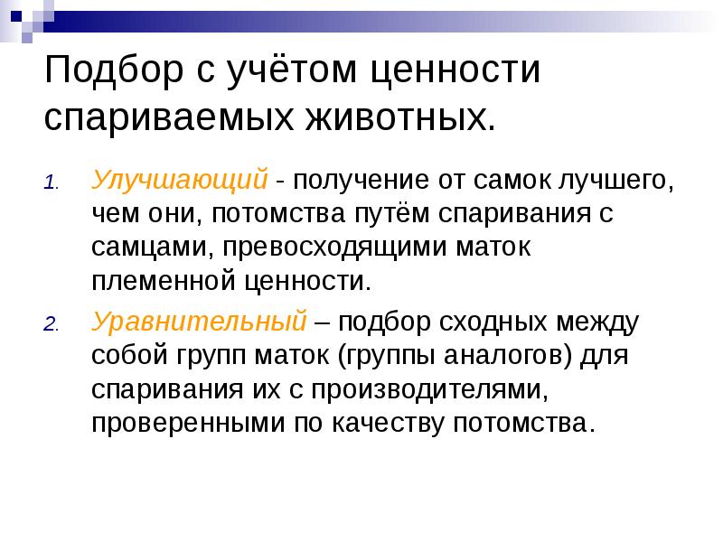 - 12. Подбор с учётом ценности спариваемых животных. Улучшающий - получение от самок