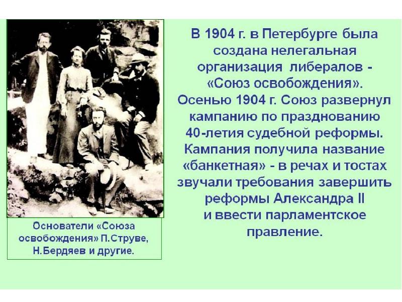 - 19. Либеральные организации 1902 г. – за границей начал выходить журнал «Освобождение»,