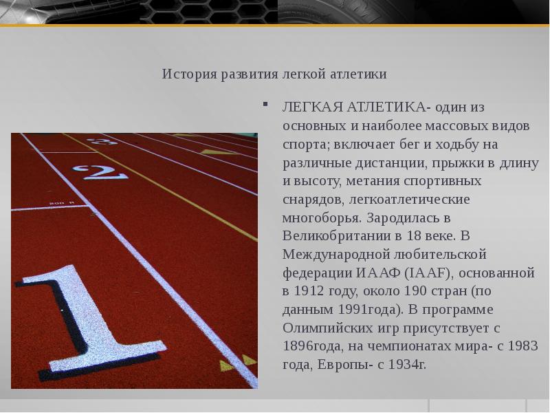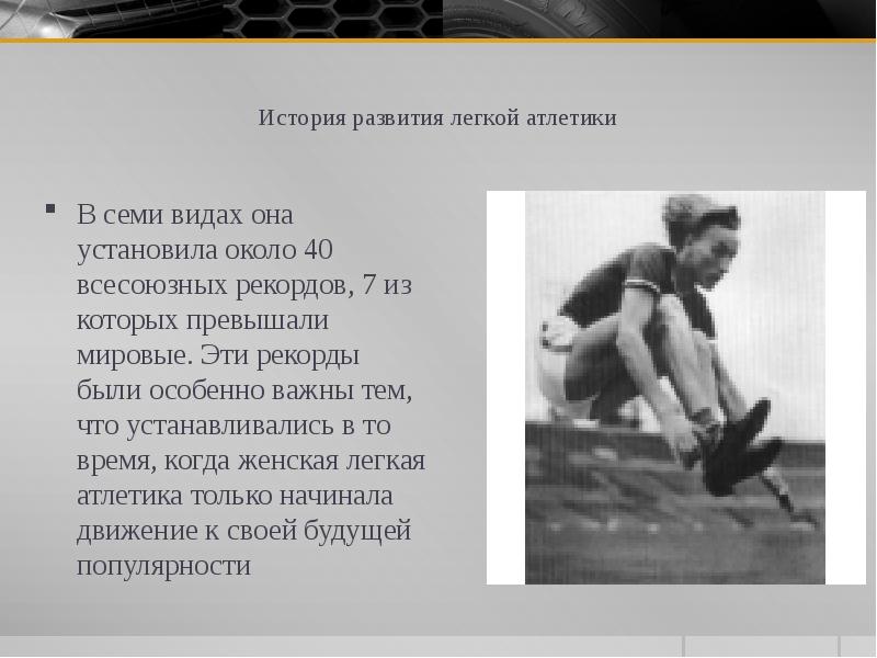 - 36. История развития легкой атлетики В семи видах она установила около 40
