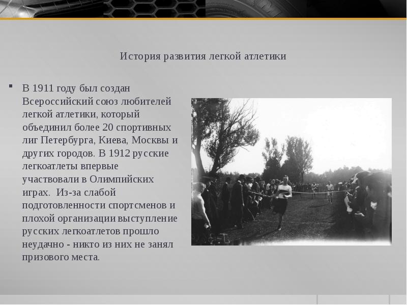 - 13. История развития легкой атлетики В 1911 году был создан Всероссийский союз