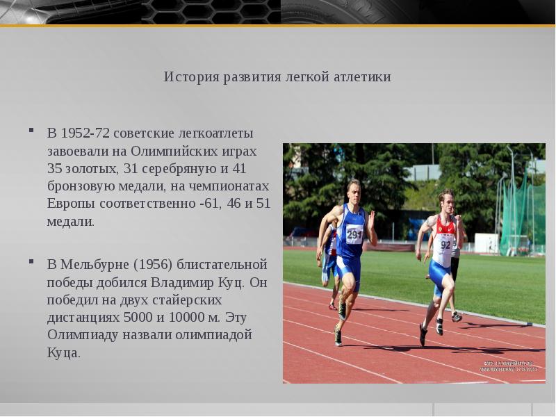 - 17. История развития легкой атлетики В 1952-72 советские легкоатлеты завоевали на Олимпийских