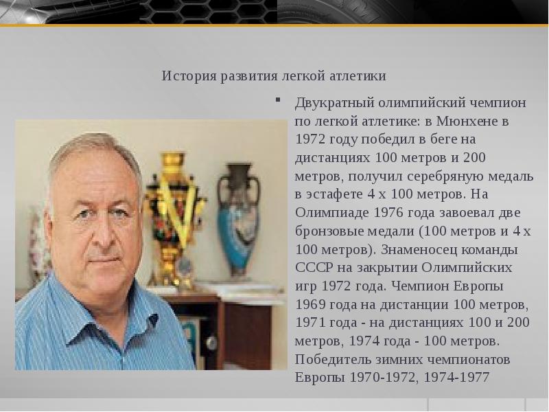- 32. История развития легкой атлетики Заслуженный мастер спорта СССР (1983). Чемпион Олимпийских