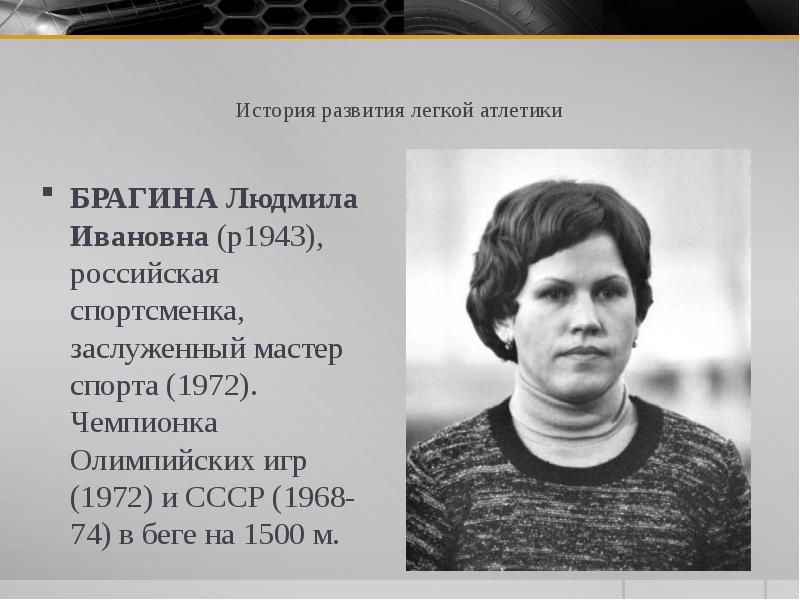 - 26. История развития легкой атлетики БРАГИНА Людмила Ивановна (р1943), российская спортсменка, заслуженный