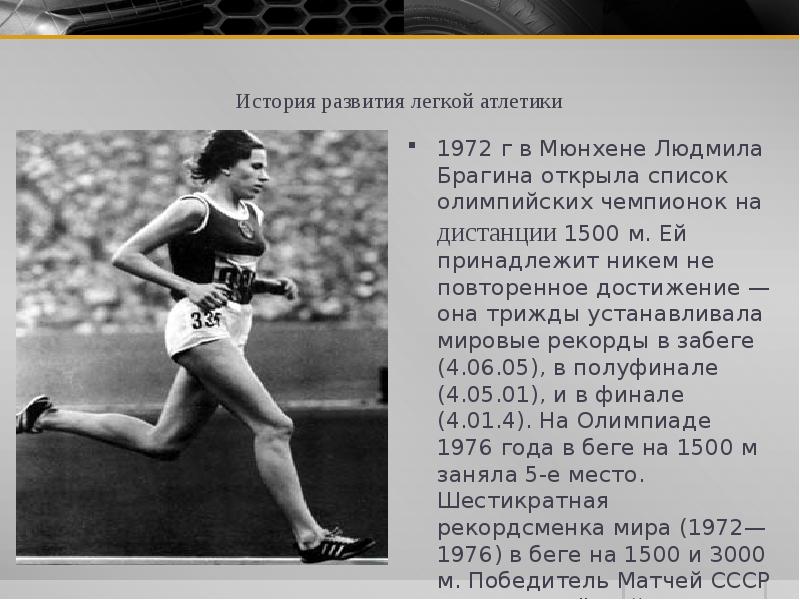- 27. История развития легкой атлетики 1972 г в Мюнхене Людмила Брагина открыла