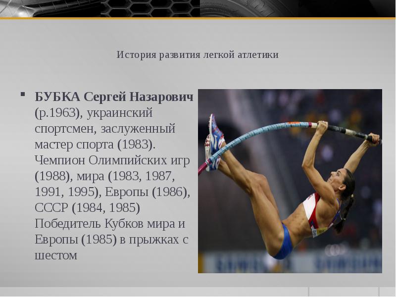 - 31. История развития легкой атлетики БУБКА Сергей Назарович (р.1963), украинский спортсмен, заслуженный