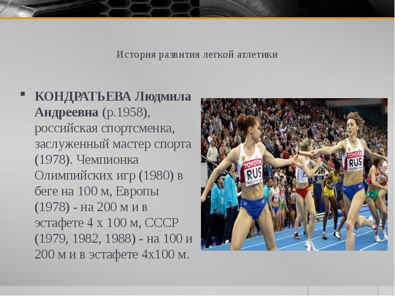 - 33. История развития легкой атлетики КОНДРАТЬЕВА Людмила Андреевна (р.1958), российская спортсменка, заслуженный