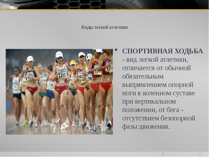 - 5. Виды легкой атлетики СПОРТИВНАЯ ХОДЬБА - вид легкой атлетики, отличается от
