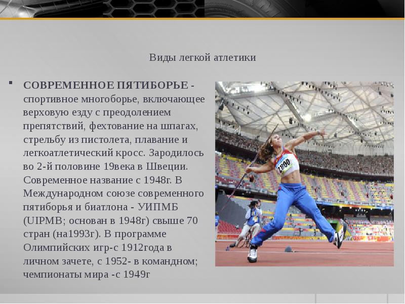 - 7. Виды легкой атлетики СОВРЕМЕННОЕ ПЯТИБОРЬЕ - спортивное многоборье, включающее верховую езду