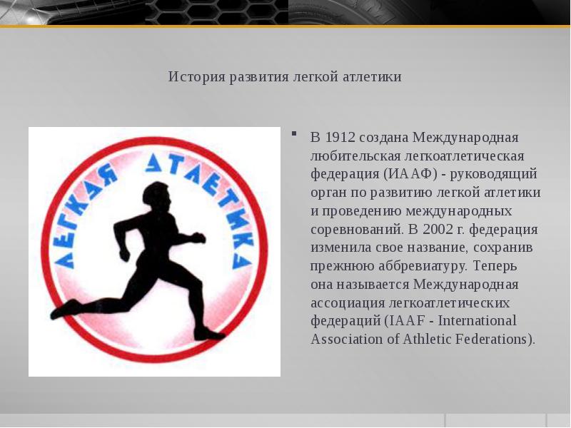 - 10. История развития легкой атлетики В 1912 создана Международная любительская легкоатлетическая федерация