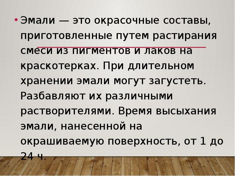 - 11. Эмали — это окрасочные составы, приготовленные путем растирания смеси из пигментов
