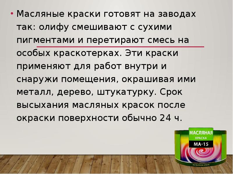- 4. Масляные краски готовят на заводах так: олифу смешивают с сухими пигментами