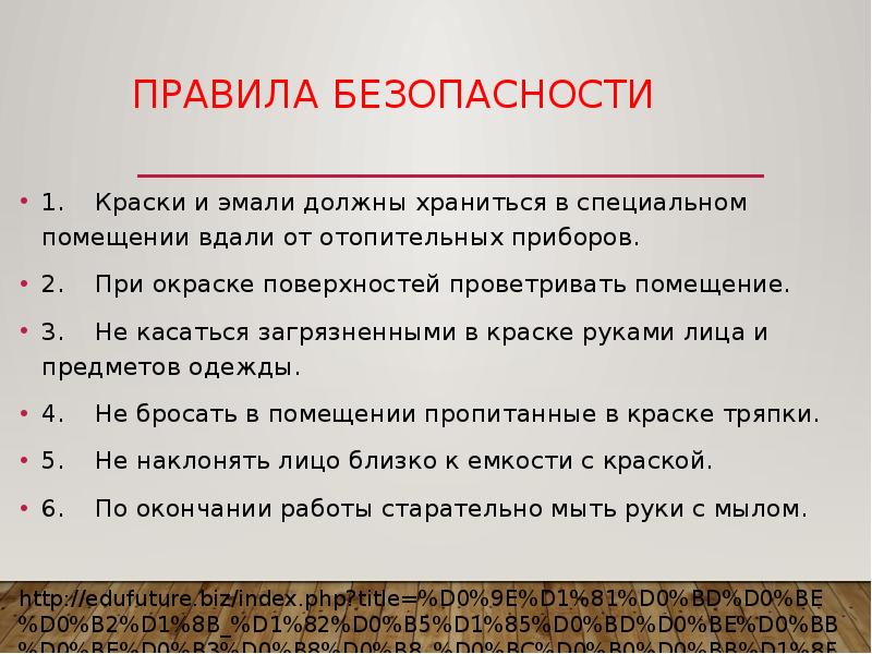 - 31. Правила безопасности 1. Краски и эмали должны храниться в специальном