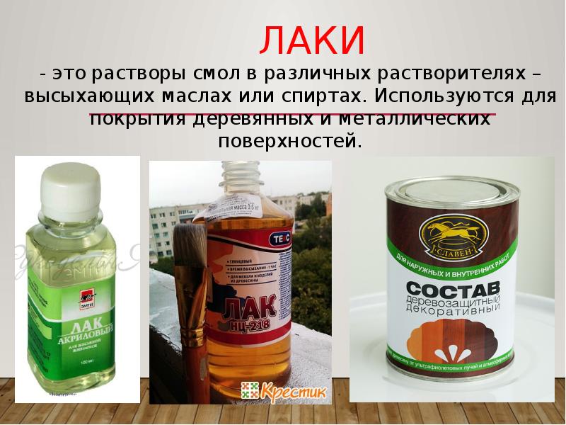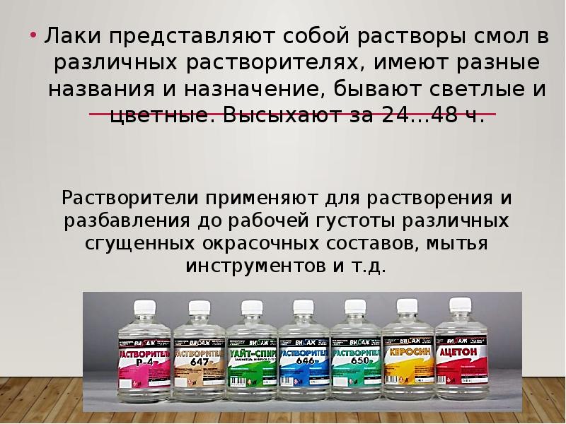 - 9. Лаки представляют собой растворы смол в различных растворителях, имеют разные названия