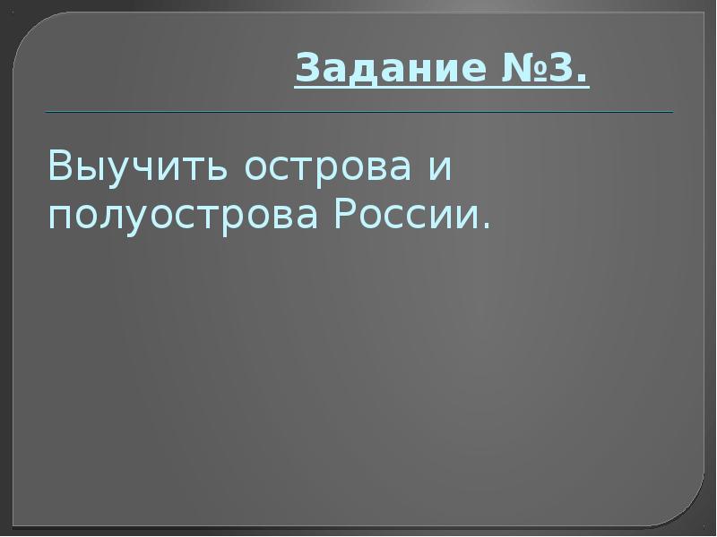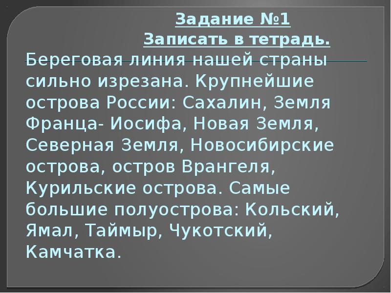 - 17. Задание №3. Выучить острова и полуострова России.