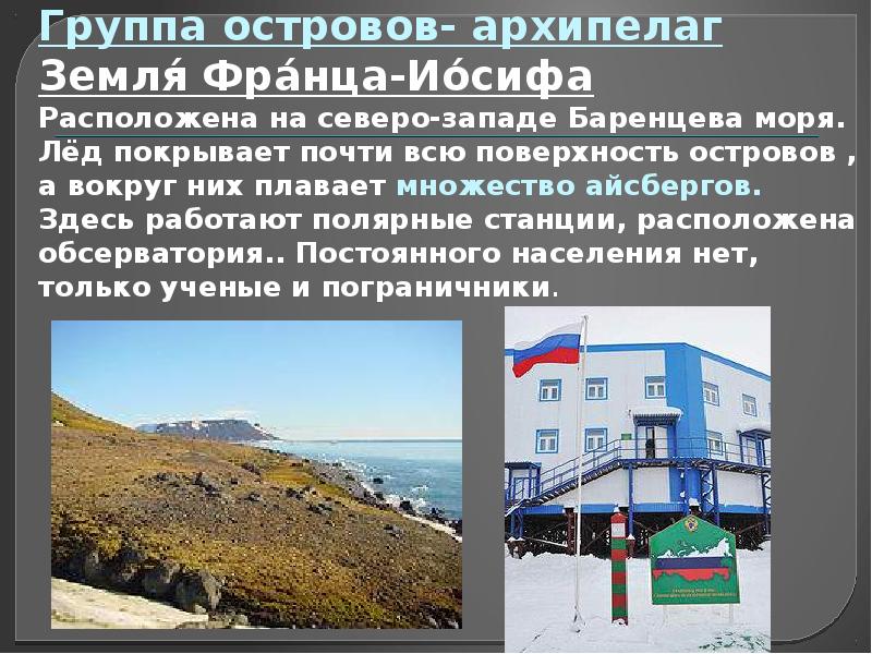 - 6. Группа островов- архипелаг Земля́ Фра́нца-Ио́сифа Расположена на северо-западе Баренцева моря. Лёд