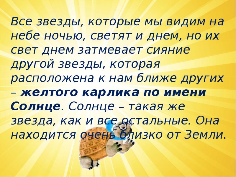 Скачать презентацию на тему Почему Солнце светит днем, а звезды – ночью?» можно ниже: