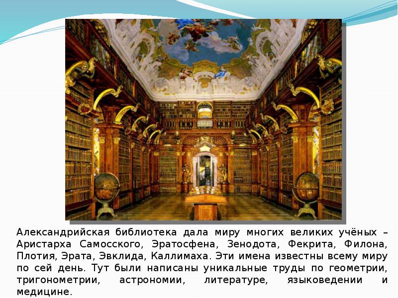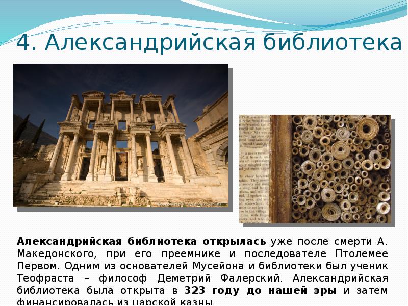 - 13. 4. Александрийская библиотека При Музее находилась знаменитая библиотека.