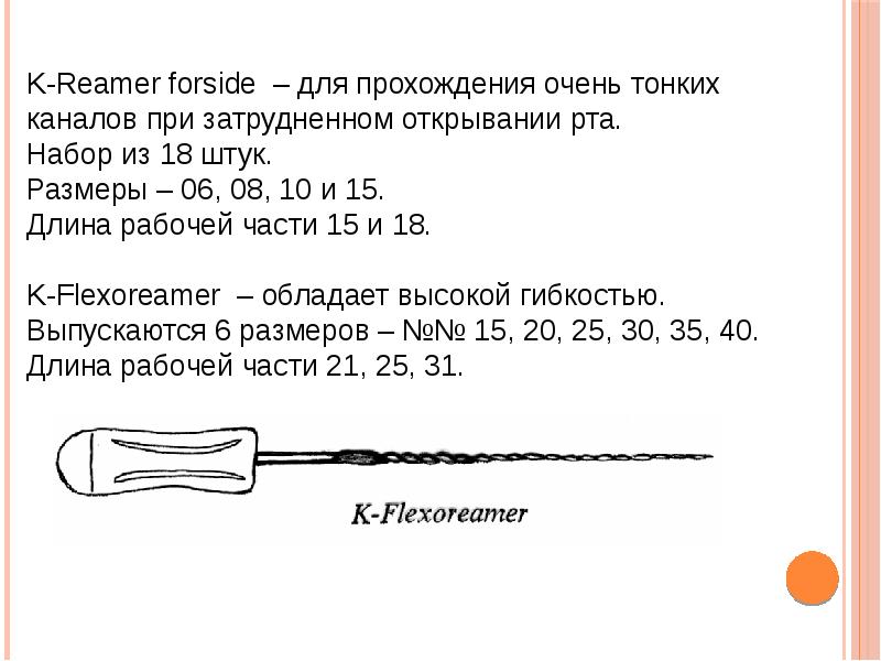 - 22. K-Reamer – жесткий каналорасширитель или дриль Керра. Выпускается 20 размеров