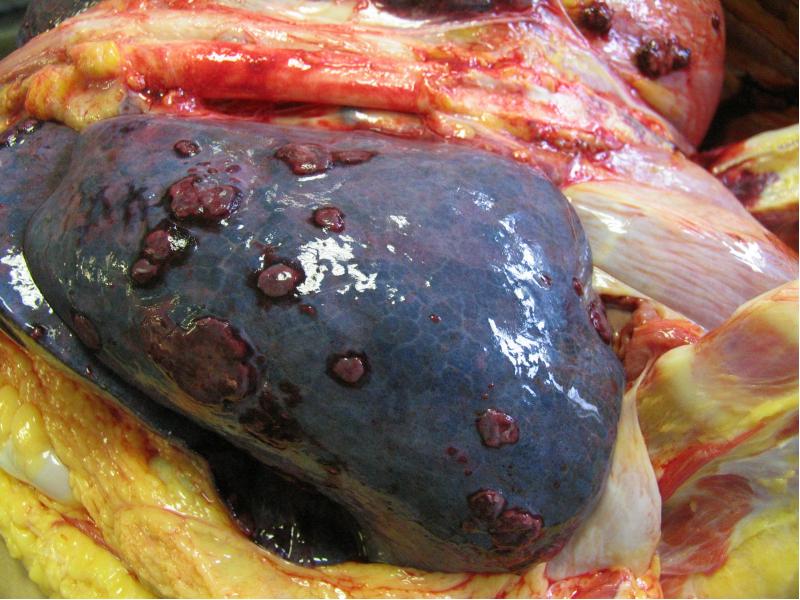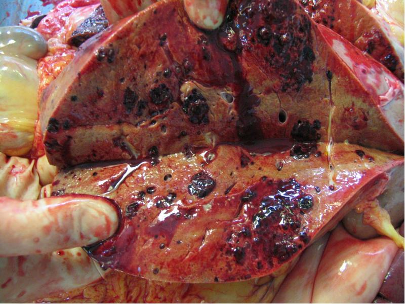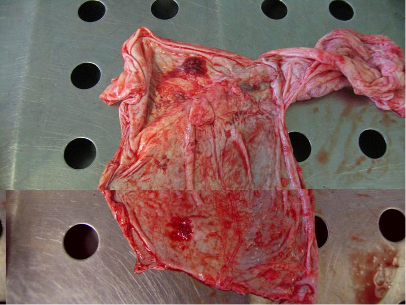- 75. С поверхности среза стекает обильная пенистая серо-красная жидкость. На ощупь ткань