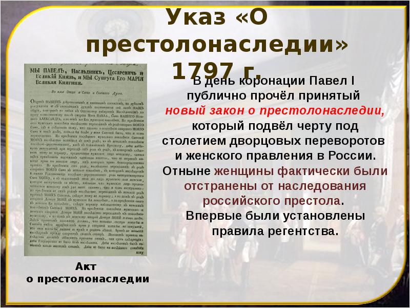 - 18. Указ «О престолонаследии» 1797 г. Наследником престола становился