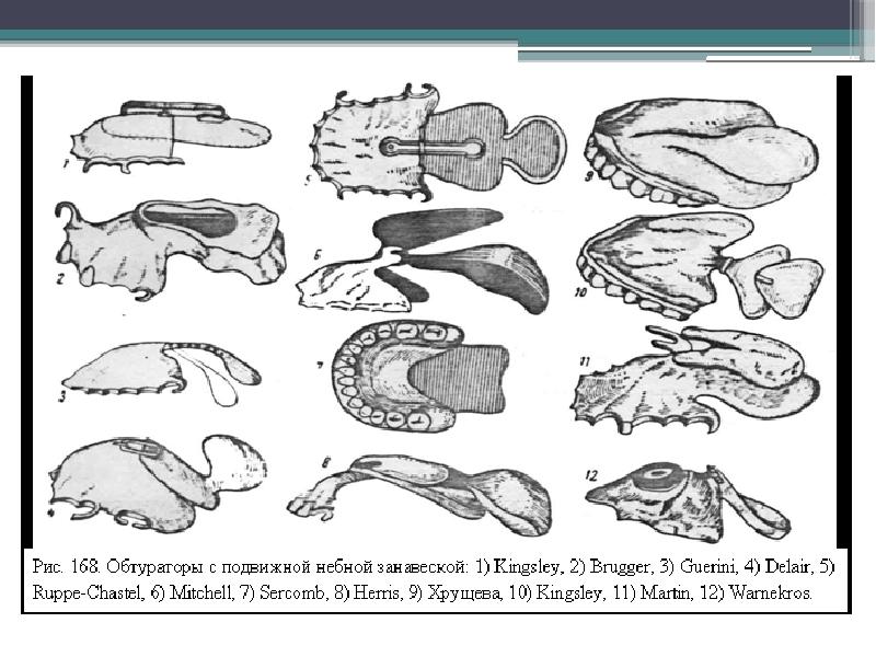 - 25. Обтураторы для замещения дефектов мягкого неба: а - по Ильиной-Маркосян; б-