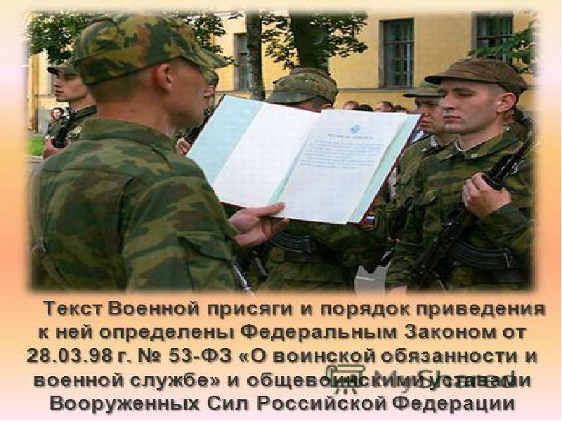- 12. Текст Военной присяги: “Я, (фамилия, имя, отчество), торжественно Текст