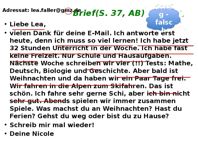 vielen Dank für deine E-Mail. Ich antworte erst heute, denn ich muss so viel lernen! Ich habe jetzt 32 Stunden Unterricht in der Woche. Ich habe fast keine Freizeit. Nur Schule und Hausaufgaben. Nächste Woche schreiben wir vier (!!) Tests: Mathe, Deutsch, Biologie und Geschichte. Aber bald ist Weihnachten und da haben wir ein Paar Tage frei. Wir fahren in die Alpen zum Skifahren. Das ist schön. Ich fahre sehr gerne Schi, aber ich bin nicht sehr gut. Abends spielen wir immer zusammen Spiele. Was machst du an Weihnachten? Hast du Ferien? Gehst du weg oder bist du zu Hause?