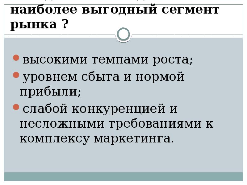 - 13. Чем должен обладать наиболее выгодный сегмент рынка ? высокими темпами роста;