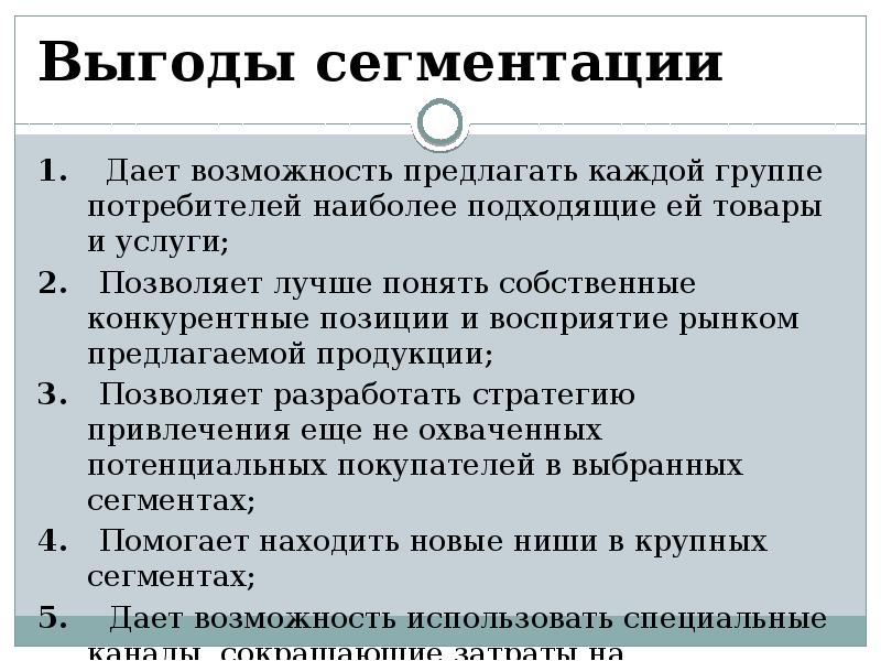 - 4. Выгоды сегментации 1. Дает возможность предлагать каждой группе потребителей наиболее подходящие