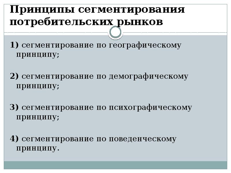 - 7. Принципы сегментирования потребительских рынков 1) сегментирование по географическому принципу; 2)