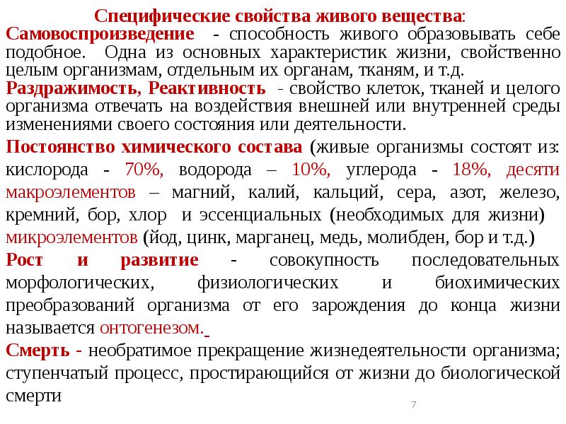 - 6. Живое вещество (организм) Организм - реальный носитель жизни, характеризующийся всеми ее