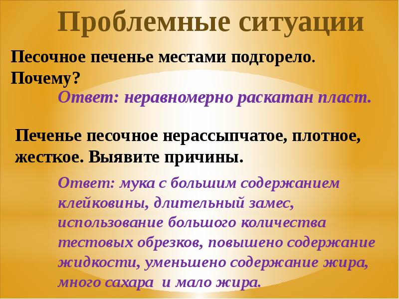 - 16. После выпечки песочный полуфабрикат бледный почему? Ответ: Низкая температура выпечки.