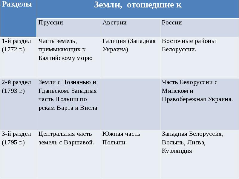 - 27. Разделы Речи Посполитой Участники: Россия, Пруссия, Австрия. Итоги: К России отошли