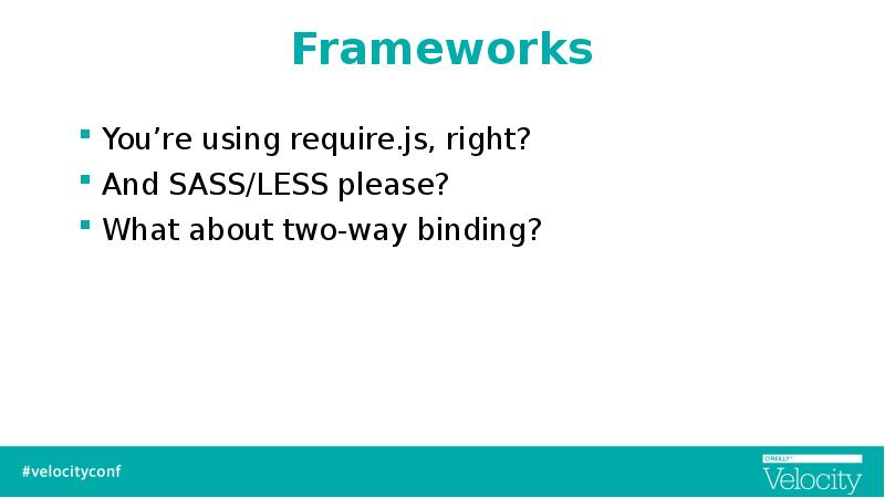Frameworks You’re using require.js, right? And SASS/LESS please? What about two-way binding?