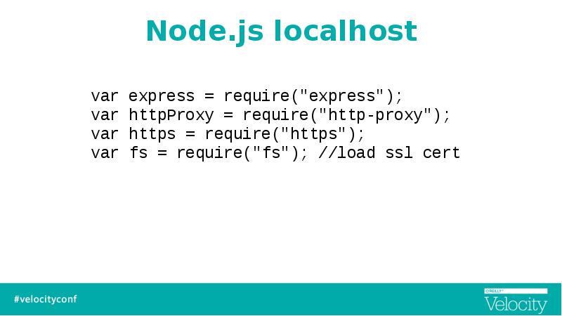 Node.js localhost var express = require("express"); var httpProxy = require("http-proxy"); var https = require("https"); var fs = require("fs"); //load ssl cert