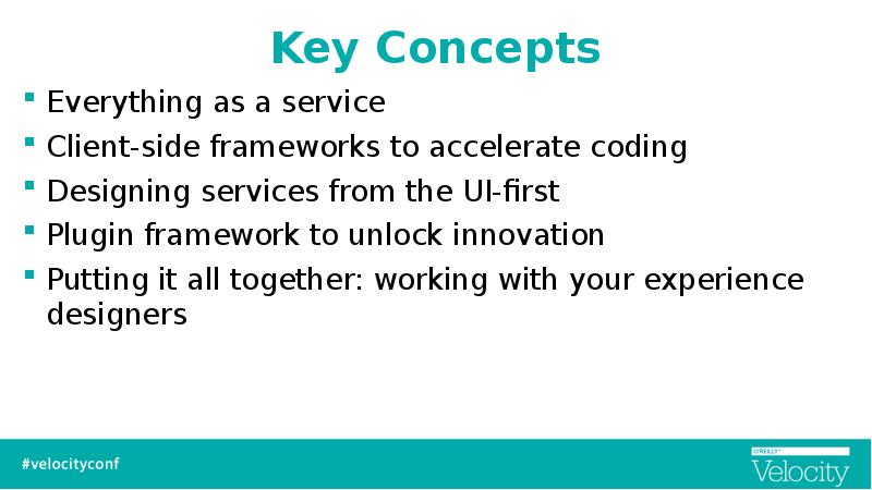 Key Concepts Everything as a service Client-side frameworks to accelerate coding Designing services from the UI-first Plugin framework to unlock innovation Putting it all together: working with your experience designers