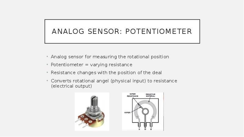 - 15. Analog sensor: Potentiometer Analog sensor for measuring the rotational position Potentiometer