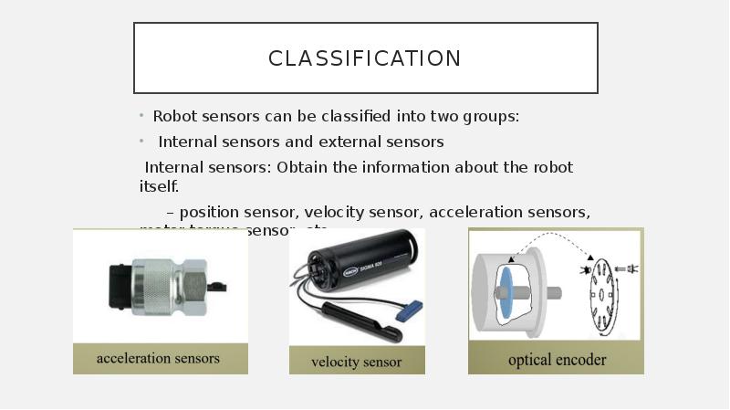 - 7. classification Robot sensors can be classified into two groups: Internal sensors