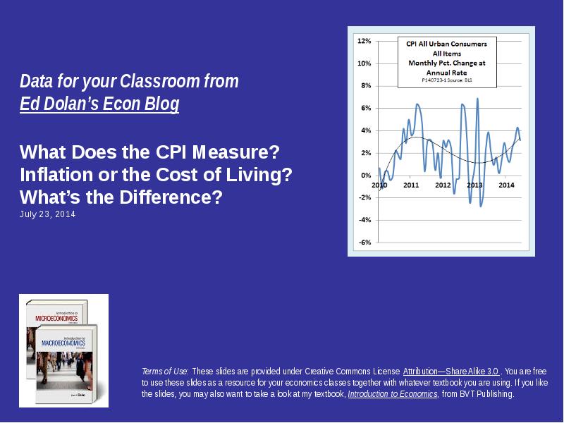 Data for your Classroom from Ed Dolan’s Econ Blog What Does the CPI Measure? Inflation or the Cost of Living? What’s the Difference? July 23, 2014 Terms of Use: These slides are provided under Creative Commons License Attribution—Share Alike 3.0 . You are free to use these slides as a resource for your economics classes together with whatever textbook you are using. If you like the slides, you may also want to take a look at my textbook, Introduction to Economics, from BVT Publishing.