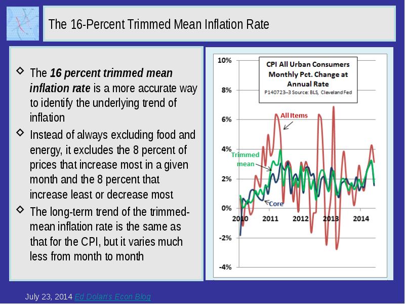The 16-Percent Trimmed Mean Inflation Rate The 16 percent trimmed mean inflation rate is a more accurate way to identify the underlying trend of inflation Instead of always excluding food and energy, it excludes the 8 percent of prices that increase most in a given month and the 8 percent that increase least or decrease most The long-term trend of the trimmed-mean inflation rate is the same as that for the CPI, but it varies much less from month to month