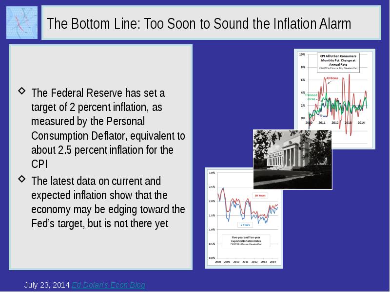 The Bottom Line: Too Soon to Sound the Inflation Alarm The Federal Reserve has set a target of 2 percent inflation, as measured by the Personal Consumption Deflator, equivalent to about 2.5 percent inflation for the CPI The latest data on current and expected inflation show that the economy may be edging toward the Fed’s target, but is not there yet