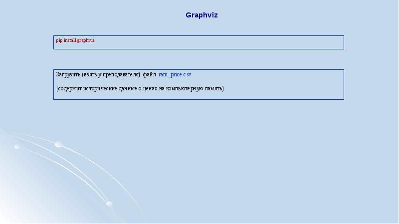 Graphviz pip install graphviz Загрузить (взять у преподавателя) файл презентация