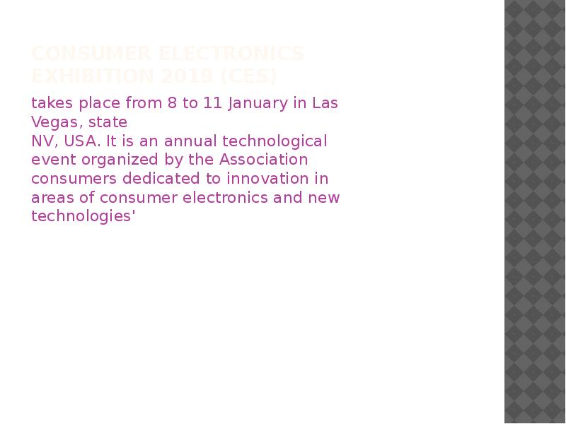 - 11. Consumer electronics exhibition 2019 (CES) takes place from 8 to 11