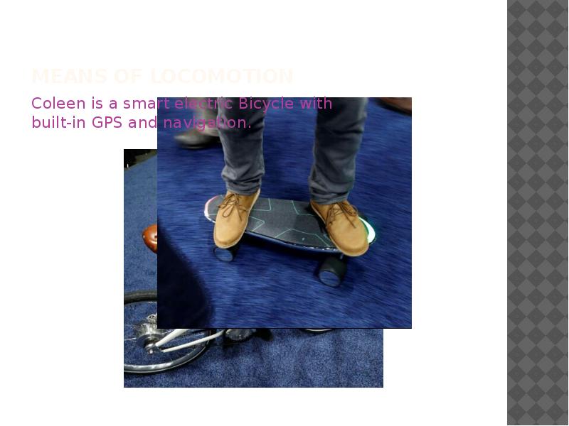 - 10. means of locomotion Coleen is a smart electric Bicycle with built-in