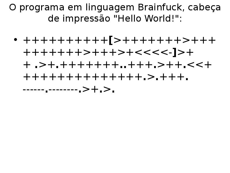 ++++++++++[>+++++++>++++++++++>+++>+<<<<-]>++ O programa em linguagem Brainfuck, cabeça de impressão "Hello World!":