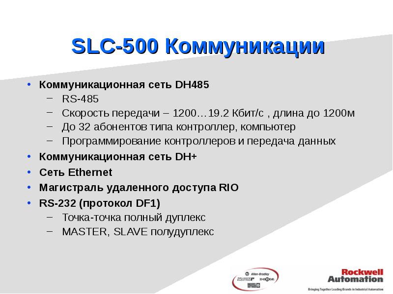 - 20. SLC-500 Коммуникации Коммуникационная сеть DH485 RS-485 Скорость передачи – 1200…19.2