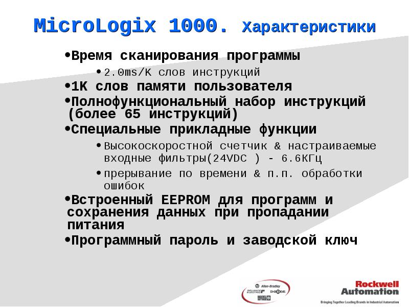 - 10. MicroLogix 1500. Процессор 8 Кслов динамической памяти пользователя Время сканирования программы
